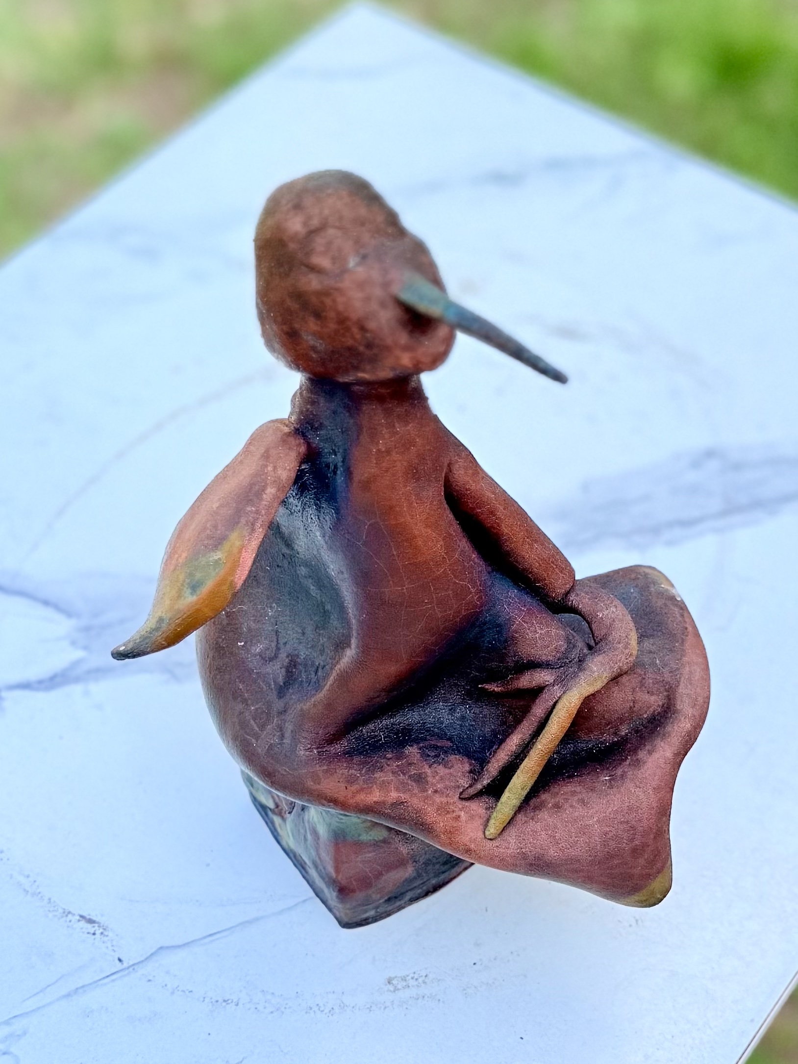 Standing at almost 10 inches, Hummingman is the product of handbuilding and copper matte firing.